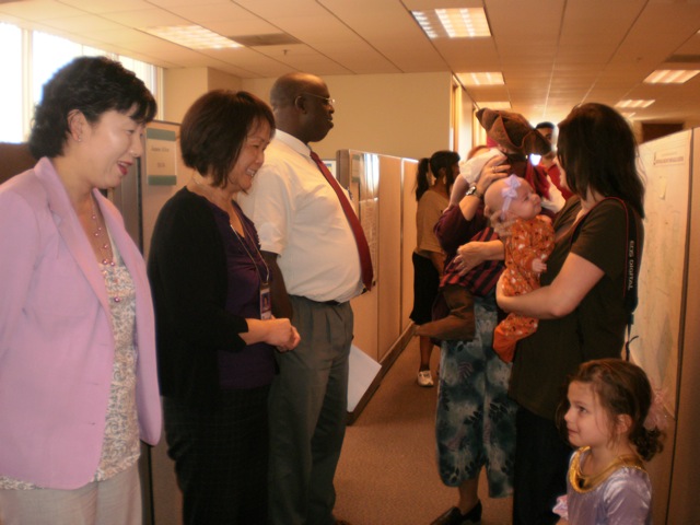 Today was the Costume Parade at school. I wore my Jasmine costume and Adam wore his Pirate costume. Mommy and Grandma came and brought Ellie & Rose. After the parade, we went up to Mommy's office to visit her coworkers.