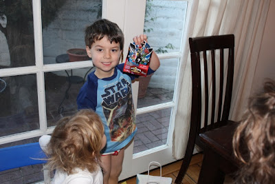 We gave Adam his birthday present this morning since we ran out of time to do it yesterday. He got some Power Ranger toys and Magic School Bus books. In the evening our family came over and played Pin the Tail on the Donkey. It was the set that Mommy played with when she was a little girl! Anna brought Adam a cool fighter pilot costume and I sang my favorite song "Diamonds" by Rihanna for everyone.